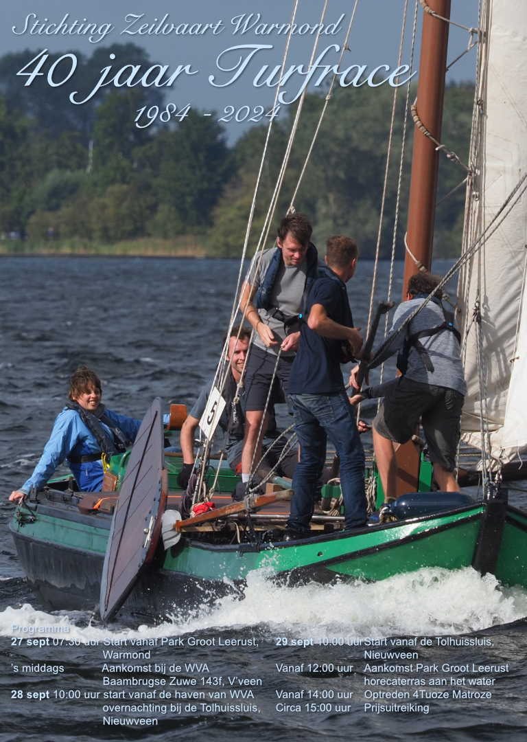 | Turfrace Warmond – Vinkeveen vv | Vrijdag 25, zaterdag 26 en zondag 27 september 2026 Vrijdag: Start Warmond: vrijdag om 07:30 uur vanaf Park Groot Leerust Aankomst Vinkeveen: tussen ong. 15:00 uur en 18:00 uur, Watersportvereniging Vinkeveen Abcoude (WVA) aan de Baambrugse Zuwe (Zandeiland 4, toegang eiland tegenover No.194) Zaterdag: Start Vinkeveen: 10:00 uur vanaf WVA Zondag: Finish en prijsuitreiking Warmond: zondagmiddag 12:00 – 15:00 uur in Park Groot Leerust. Track & Trace: Alle drie de dagen zijn de wedstrijden via ons Track & Trace systeem op internet te volgen: https://tt.zeilvaartwarmond.nl, In de tent in het park zijn de tracks van de schepen zondag ook op een groot TV scherm te volgen. autoroute langs de Turfrace – fietsroute langs de Turfrace ![]() |